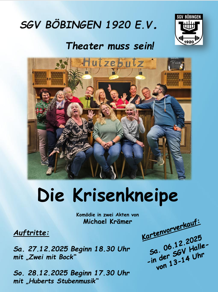 - Weitere Karten können an den Montagen 09.12., 16.12. und 23.12. zwischen 19:00 und 19:30 Uhr ebenfalls in der SGV-Halle erworben werden.